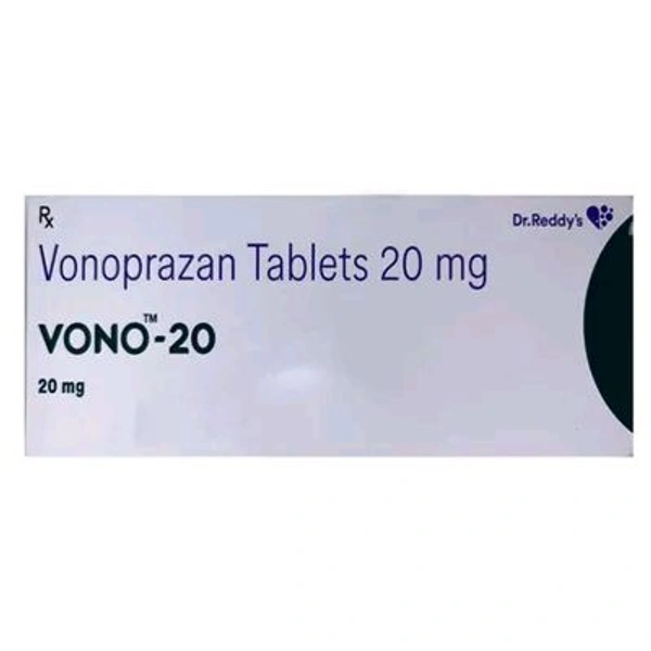 Vono-20 Tablet 10's is used to treat reflux esophagitis, gastric ulcers, and duodenal ulcers. It also helps prevent the recurrence of gastric or duodenal ulcers during the use of low-dose aspirin or NSAIDs. It works by reducing the amount of acid produced in the stomach. Common side effects may include diarrhoea, bloating, stomach pain, nausea, and indigestion. Before starting Vono-20 Tablet 10's, let the doctor know if you are pregnant, breastfeeding, taking other medicines or have pre-existing medical conditions.
