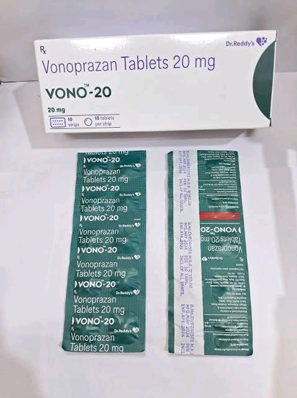 Vono 20 mg tablet contains Vonoprazan, a potassium-competitive acid blocker (P-CAB) used to treat gastroesophageal reflux disease (GERD), heartburn, erosive esophagitis, and stomach/duodenal ulcers. It works by rapidly reducing stomach acid secretion. It is also used with antibiotics to eradicate H. pylori infection
