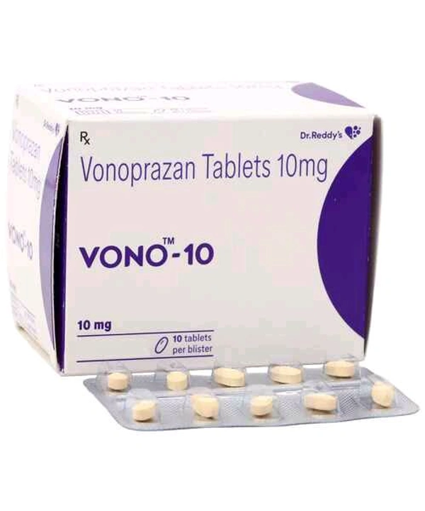 Vono-10 Tablet 10's is used to treat reflux esophagitis, gastric ulcers, and duodenal ulcers. It also helps prevent the recurrence of gastric or duodenal ulcers during the use of low-dose aspirin or NSAIDs. It works by reducing the amount of acid produced in the stomach. Common side effects may include diarrhoea, bloating, stomach pain, nausea, and indigestion. Before starting Vono-10 Tablet 10's, let the doctor know if you are pregnant, breastfeeding, taking other medicines or have pre-existing medical conditions.