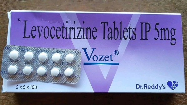 Vozet Tablet is used to treat various kinds of allergies, including hay fever (caused by pollen or dust), conjunctivitis (itchy eyes), eczema (dermatitis), hives (raised patches), reactions to insect bites and stings, and some food allergies. It contains Levocetirizine, which blocks histamine, a chemical that plays a key role in allergic reactions. Common side effects may include headaches, dry mouth, dizziness, stomach pain, sickness, and diarrhoea, but these usually resolve on their own. Before using this medicine, tell your doctor if you are allergic to any of its ingredients, have any existing medical conditions, or are taking other medications. Avoid taking this medicine with dairy products, as they may reduce its effectiveness.