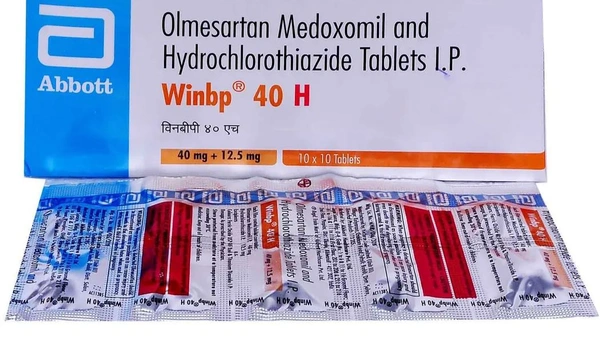 Winbp 40 H Tablet is used to treat high blood pressure (hypertension). It contains Olmesartan medoximil and Hydrochlorothiazide, which relaxes and widens the narrowed blood vessels. This allows the blood to flow more smoothly in the blood vessels, and the heart can pump more efficiently. Also, it removes extra water/fluid and certain electrolyte overload from the body. In some cases, you may experience side effects such as nausea, upset stomach, dehydration, headache, diarrhoea, electrolyte imbalance, dizziness, and decreased blood pressure. Before taking this medicine, you should tell your doctor if you are allergic to any of its components or if you are pregnant/breastfeeding, and about all the medications you are taking and pre-existing medical conditions.