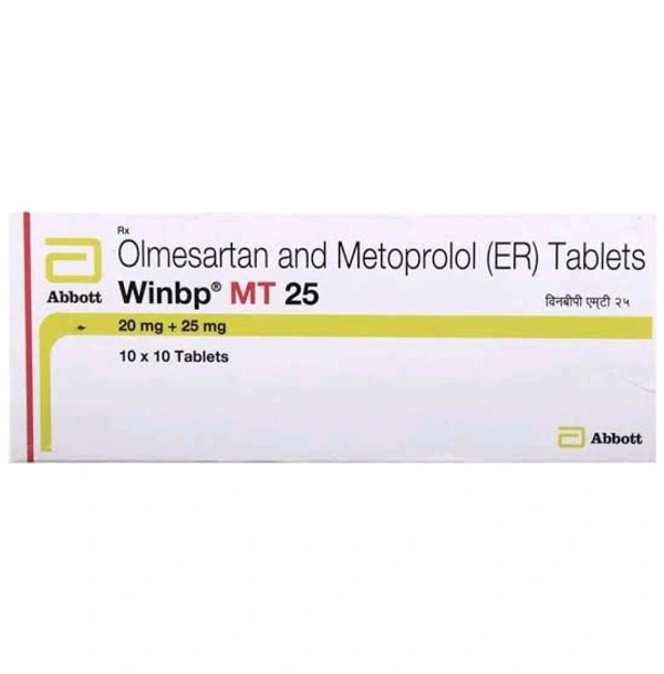 WINBP MT 25MG TABLET is used to treat high blood pressure. It contains Olmesartan and Metoprolol, which work by relaxing blood vessels. This allows the blood to flow more smoothly and the heart to pump more efficiently. Thus, it lowers blood pressure and helps in reducing the risk of stroke, heart attack, other heart problems, or kidney problems in the future. In some cases, you may experience headaches, nausea, dizziness, increased potassium levels, and low blood pressure. Before taking this medicine, you should tell your doctor if you are allergic to any of its components or if you are pregnant/breastfeeding, and about all the medications you are taking and pre-existing medical conditions.