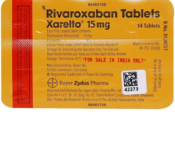 Xarelto 15 mg Tablet is used to prevent and treat deep vein thrombosis (blood clots in leg veins) and pulmonary embolism (blood clots in the lung) by reducing blood clot formation. It contains Rivaroxaban, which works by inhibiting the production of clotting factors by decreasing the action of vitamin K. This prevents the conversion of fibrinogen (soluble protein) to fibrin (insoluble protein), thereby preventing blood clots formation. You may experience bleeding, anemia (low number of red blood cells), and nausea. Before taking this medicine, you should tell your doctor if you are allergic to any of its components or if you are pregnant/breastfeeding, and about all the medications you are taking and pre-existing medical conditions.