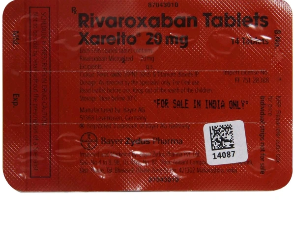 Xarelto 20 mg Tablet is used to prevent and treat deep vein thrombosis (blood clots in leg veins) and pulmonary embolism (blood clots in the lung) by reducing blood clot formation. It contains Rivaroxaban, which works by inhibiting the production of clotting factors by decreasing the action of vitamin K. This prevents the conversion of fibrinogen (soluble protein) to fibrin (insoluble protein), thereby preventing blood clots formation. You may experience bleeding, anemia (low number of red blood cells), and nausea. Before taking this medicine, you should tell your doctor if you are allergic to any of its components or if you are pregnant/breastfeeding, and about all the medications you are taking and pre-existing medical conditions.