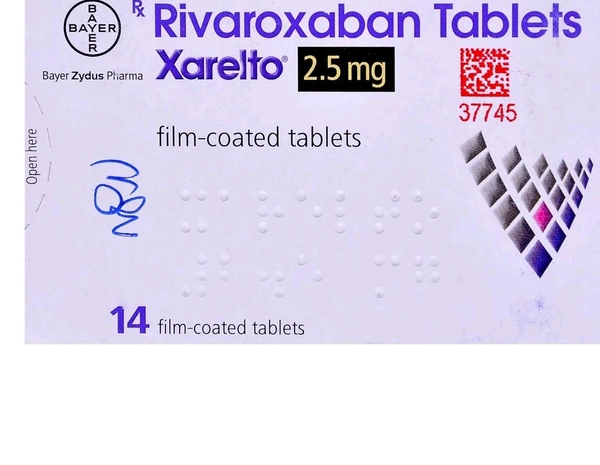Xarelto 2.5 mg Tablet is used to prevent and treat deep vein thrombosis (blood clots in leg veins) and pulmonary embolism (blood clots in the lung) by reducing blood clot formation. It contains Rivaroxaban, which works by inhibiting the production of clotting factors by decreasing the action of vitamin K. This prevents the conversion of fibrinogen (soluble protein) to fibrin (insoluble protein), thereby preventing blood clots formation. You may experience bleeding, anemia (low number of red blood cells), and nausea. Before taking this medicine, you should tell your doctor if you are allergic to any of its components or if you are pregnant/breastfeeding, and about all the medications you are taking and pre-existing medical conditions.