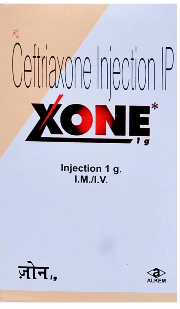 Xone 1gm Injection is used to treat bacterial infections of the brain, lungs, middle ear, abdomen, urinary tract, kidneys, bones, joints, skin, soft tissues, blood, heart, chest, lime disease (caused by tick bites), and gonorrhoea (sexually transmitted disease). It contains Ceftriaxone, which kills the bacteria and helps in treating bacterial infection. In some cases, it may cause side effects such as diarrhoea, rashes, changes in results of blood and liver tests, and abnormalities (increase/decrease) in the number of white blood cells and platelets. Before taking this medicine, you should tell your doctor if you are allergic to any of its components or if you are pregnant/breastfeeding, and about all the medications you are taking and pre-existing medical conditions.
