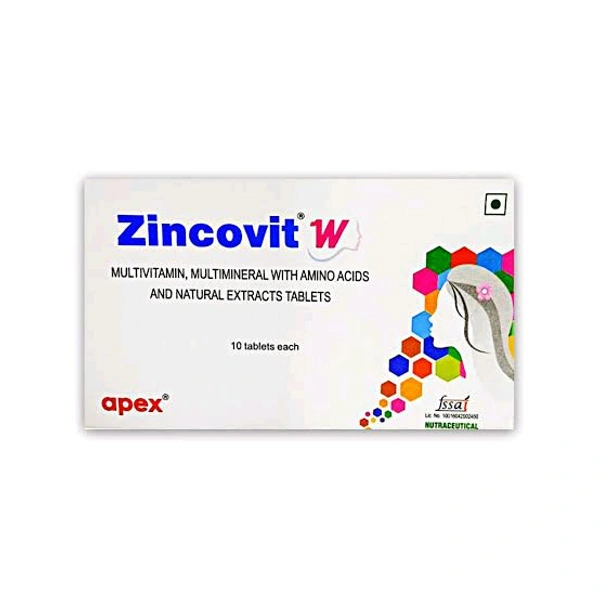 Zincovit W Tablet contains essential multivitamins, minerals, amino acids and natural plant extracts. It improves overall health and provides nutrient requirements for bodily functions. Aside from that, it can be used as a supplement for a variety of medical conditions. Calcium, Iron, Magnesium, Zinc, Copper, Manganese, Iodine, Chromium, Selenium, Vitamin A, Vitamin B Complex, Vitamin C, Folic acid, Vitamin K1, Biotin, Cholecalciferol, L- leucine, DL-methionine, L-lysine, L-valine, L-isoleucine, L-Cysteine, Myo-inositol, Choline, Cranberry extract, Citrus bioflavonoids, Green tree extract, Grape seed extract and Bacopa Monnieri are the active ingredients.