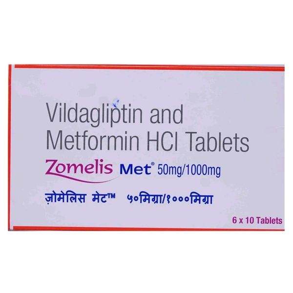 Zomelis Met 50/1000 Tablet is used in the treatment of Type 2 diabetes mellitus. It works by making the pancreas produce insulin and less glucagon and also by helps the body to make better use of the insulin it has. You must continue following the diet and exercise recommended for you whilst on treatment with this medicine. It is not a substitute for insulin. It may cause common side effects such as hypoglycemia (low blood glucose levels) characterised by dizziness, sweating, palpitations, hunger pangs, dry mouth and skin etc. So, to avoid hypoglycemia, you should not miss meals and also should carry some form of sugar along with you. Other side effects include taste change, nausea, diarrhoea, stomach pain, headache, and upper respiratory symptoms