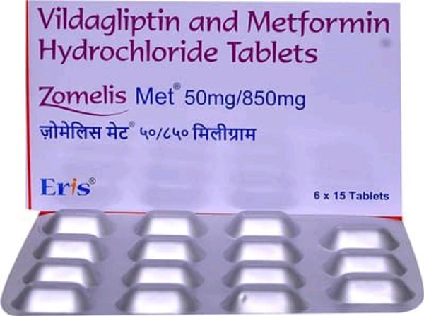 Zomelis Met 50mg/850mg Tablet is a combination of two medicines that control high blood sugar levels in people with type 2 diabetes mellitus. This helps prevent serious complications of diabetes, such as kidney damage and blindness, and may also reduce your chances of having a heart attack or stroke.