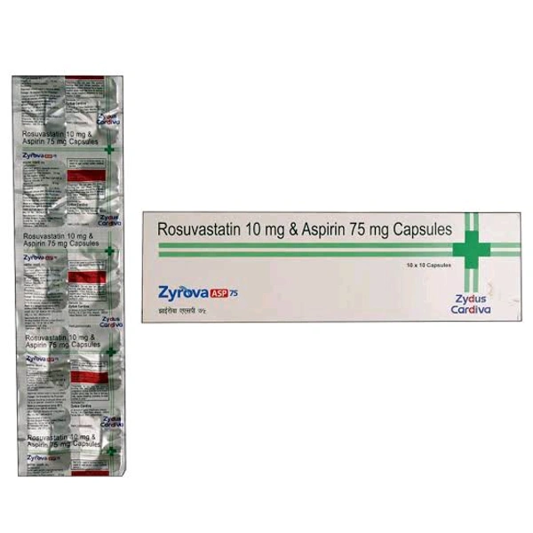 Zyrova ASP 75 Capsule is a combination of two medicines used to prevent heart attack, stroke, and angina. This medicine reduces the "bad" cholesterol (LDL) and triglycerides (fats) levels. Moreover, it also decreases the formation of blood clots.