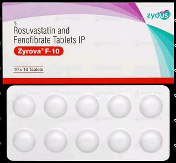 Zyrova F 10 Tablet is a combination of two lipids (fat) lowering medicines. It is used to lower the levels of lipids known as cholesterol and triglycerides in the blood when lifestyle changes (eg. low-fat diet) on their own have failed. This medicine helps to reduce the risk of heart disease.